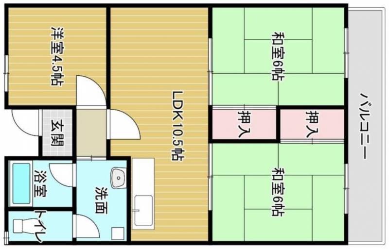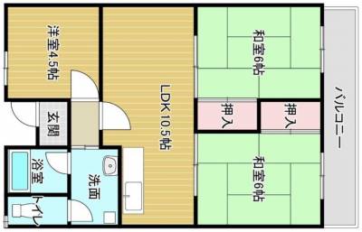 3LDK(リビング10帖、和室6帖、和室6帖、洋室4.5帖)