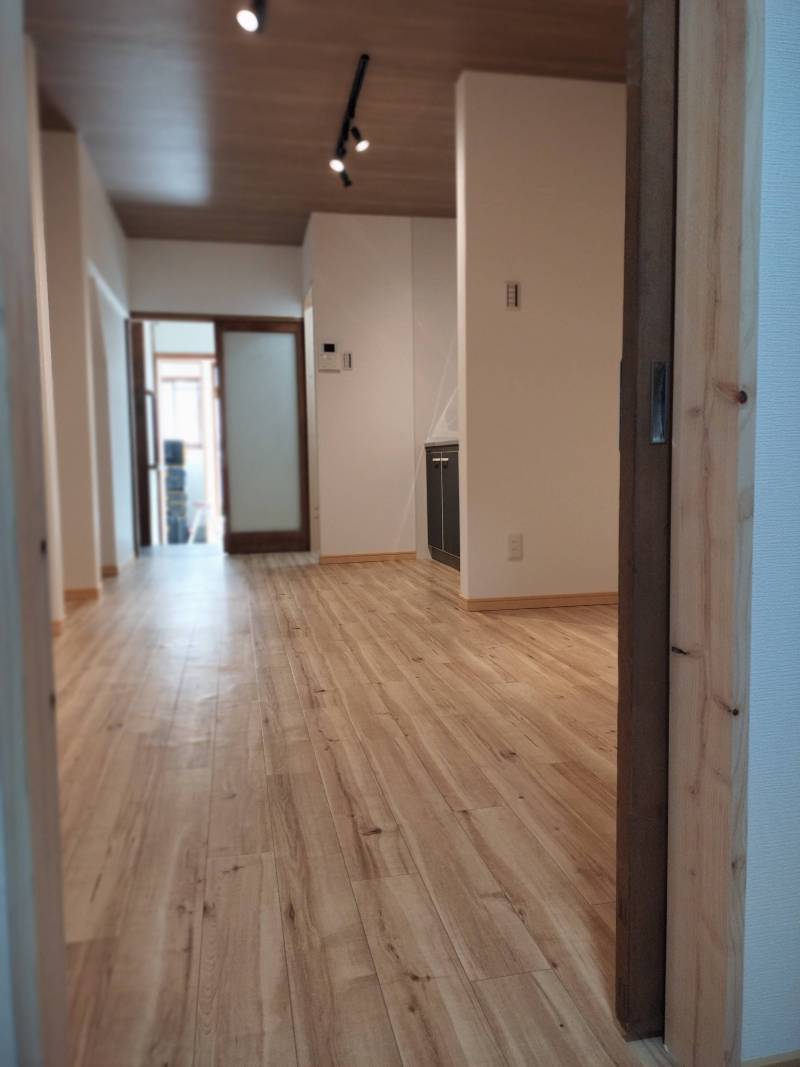 室内は木目天井とスポットライトが印象的な、カフェのような落ち着いた空間に仕上げました。明るい木目のフローリングでお部屋全体が広く感じられ、シンプルで家具も合わせやすいデザインです。