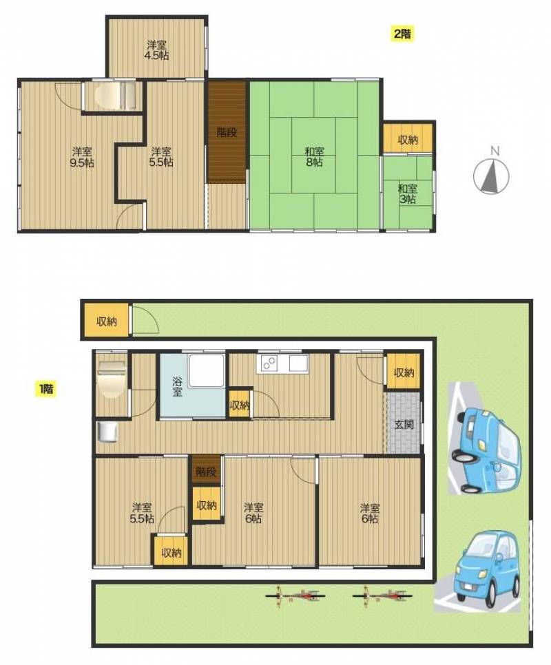 間取り8DK 1階(洋室:6畳、洋室6畳、洋室5.5畳)、2階(洋室9.5畳、洋室5.5畳、洋室4.5畳、和室8畳、和室3畳)