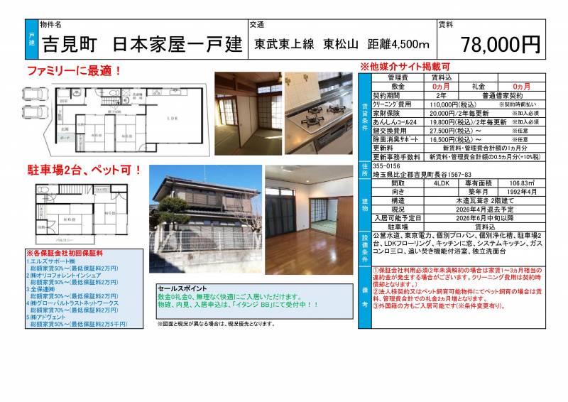 | 間取り | 4LDK 間取図を見る | 専有面積 | 106.83m2 | 築年月 | 1992年4月築 | 建物構造 | 戸建/木造 | |