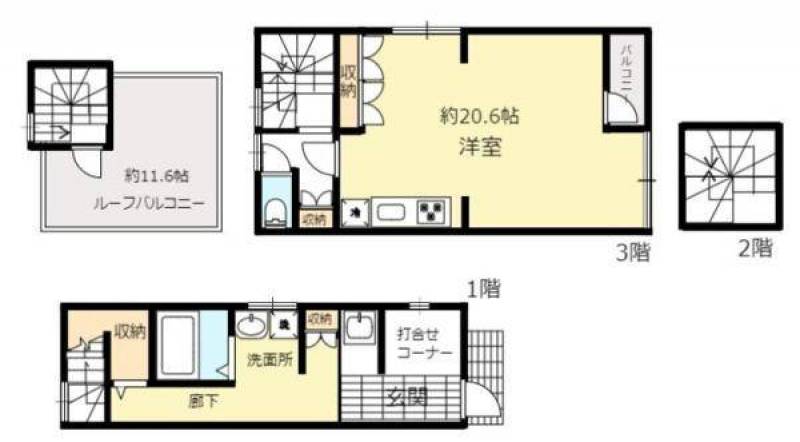 | 部屋設備・サービス | TVモニタ付インターホン / 二面採光 / クローゼット / 照明器具付き / シューズボックス / 都市ガス / フローリング / バルコニー / メゾネット / 室内洗濯機置場 |