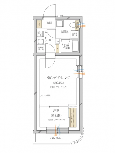 | 部屋設備・サービス | シューズボックス / 照明器具付き / クローゼット / TVモニタ付インターホン / フローリング / バルコニー / 室内洗濯機置場 / 防音 / 防音ガラス |
