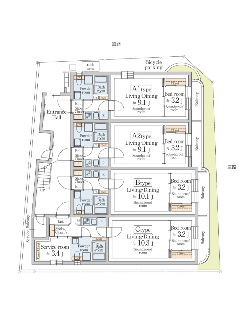 (1LDKタイプ32.40㎡×6戸、1LDKタイプ34.02㎡×3戸、1LDK+Sタイプ42.12㎡×3戸)