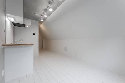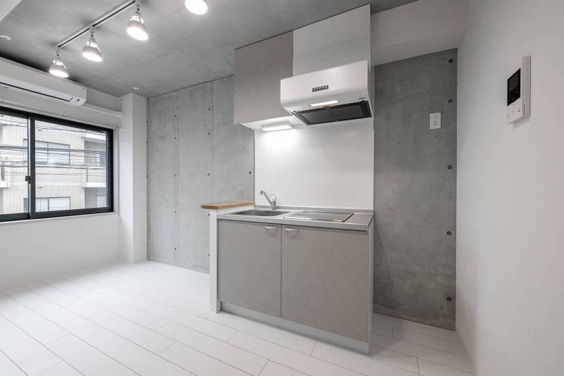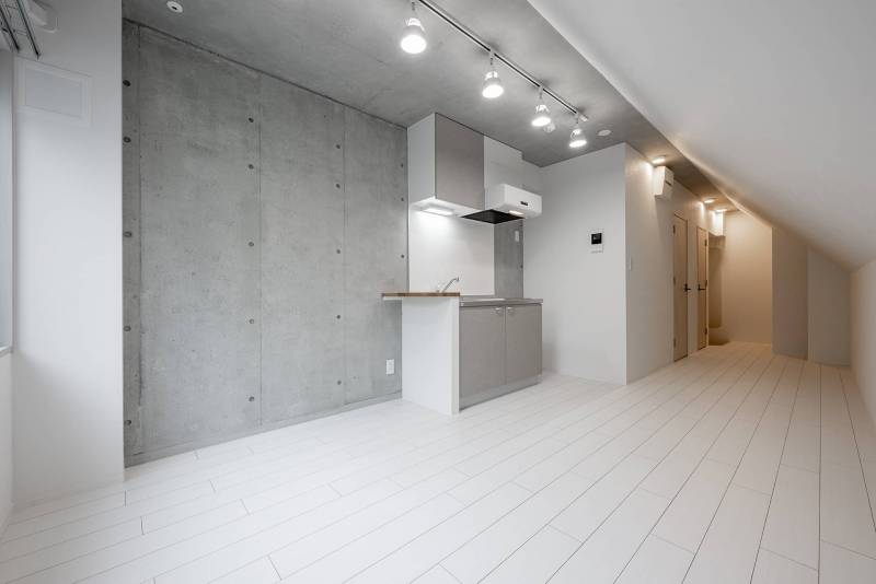 お部屋はホワイトを基調としており、コンクリート打ちっぱなしを基本としてクロスもおしゃれなものを使っています。