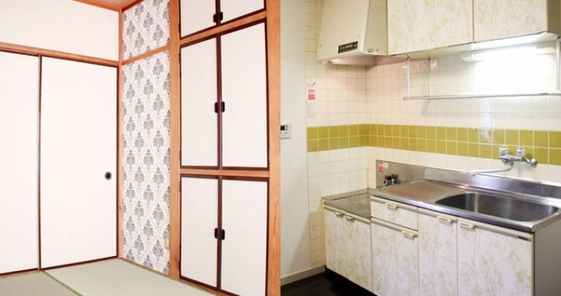 和室とキッチンにアクセントクロス。