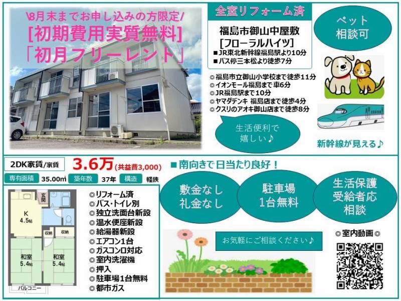 賃料帯 | 39,000円 ~ 44,000円 | 所在地 | 〒9608252 福島県福島市御山中屋敷50-1 | ||