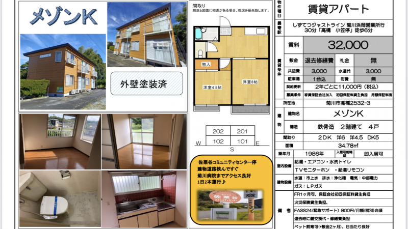 賃料:32,000円(管理費:3,000円) 敷金/礼金:敷金0/礼金0 間取り:2DK(34.78m2)