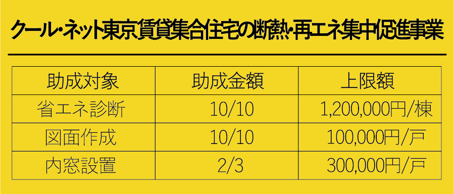 次に都の補助金です。「クール・ネット東京 賃貸住宅の断熱・再エネ集中促進事業」と言う長い名前でして、補助対象となる工事費の3分の2を補助する方式です。工事の前に省エネ診断を実施しなければならないという条件があります。この省エネ診断とそのための図面作成の費用は基本的に全額補助されます。ただし消費税は除きます。