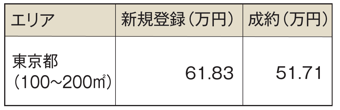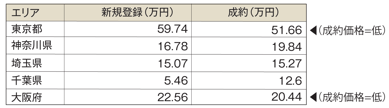 このとおり、新規登録物件に比べ成約物件の単価が低いのは東京都と大阪府になるが、東京においては両者の差がかなり開いているのが見て取れる。前者に対し、後者の数字は13.5%ほど下がっており、売り手が望む価格まで買い手が手を伸ばせずにいる状況が窺える。
